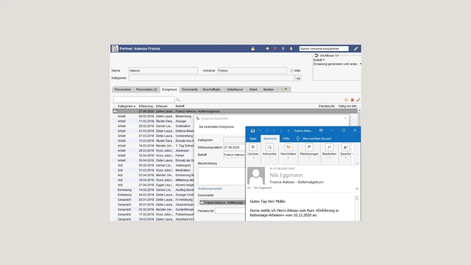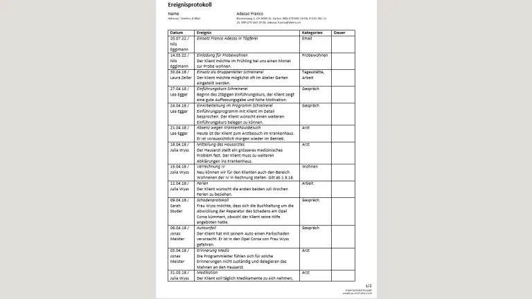 Dreh- und Angelpunkt bei der Fallverwaltung eines Klienten ist sein Ereignis-Verlauf. Ein Ereignis kann dabei ein Gespräch, eine E-Mail oder eine Abklärung mit Dritten sein.